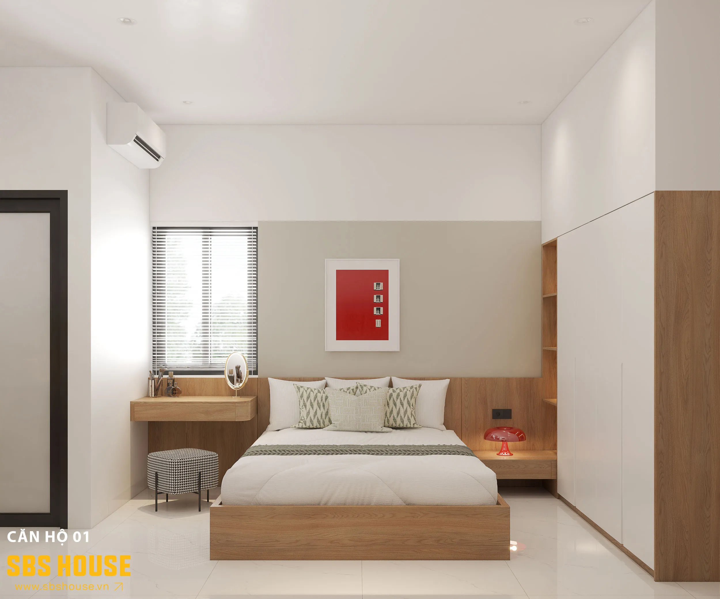 Phòng ngủ bố trí khoa học với giường ngủ, tủ quần áo, bàn làm việc hài hòa trong một diện tích vừa phải, tạo không gian riêng tư nhưng vẫn thoáng sáng. Gỗ tự nhiên, gam trắng – be nhẹ nhàng giúp tổng thể nội thất hiện đại nhưng không lạnh lẽo, tạo cảm giác thư giãn cho người thuê. Mỗi chi tiết trong căn hộ đều hướng đến trải nghiệm sống thoải mái và tiện lợi nhất.