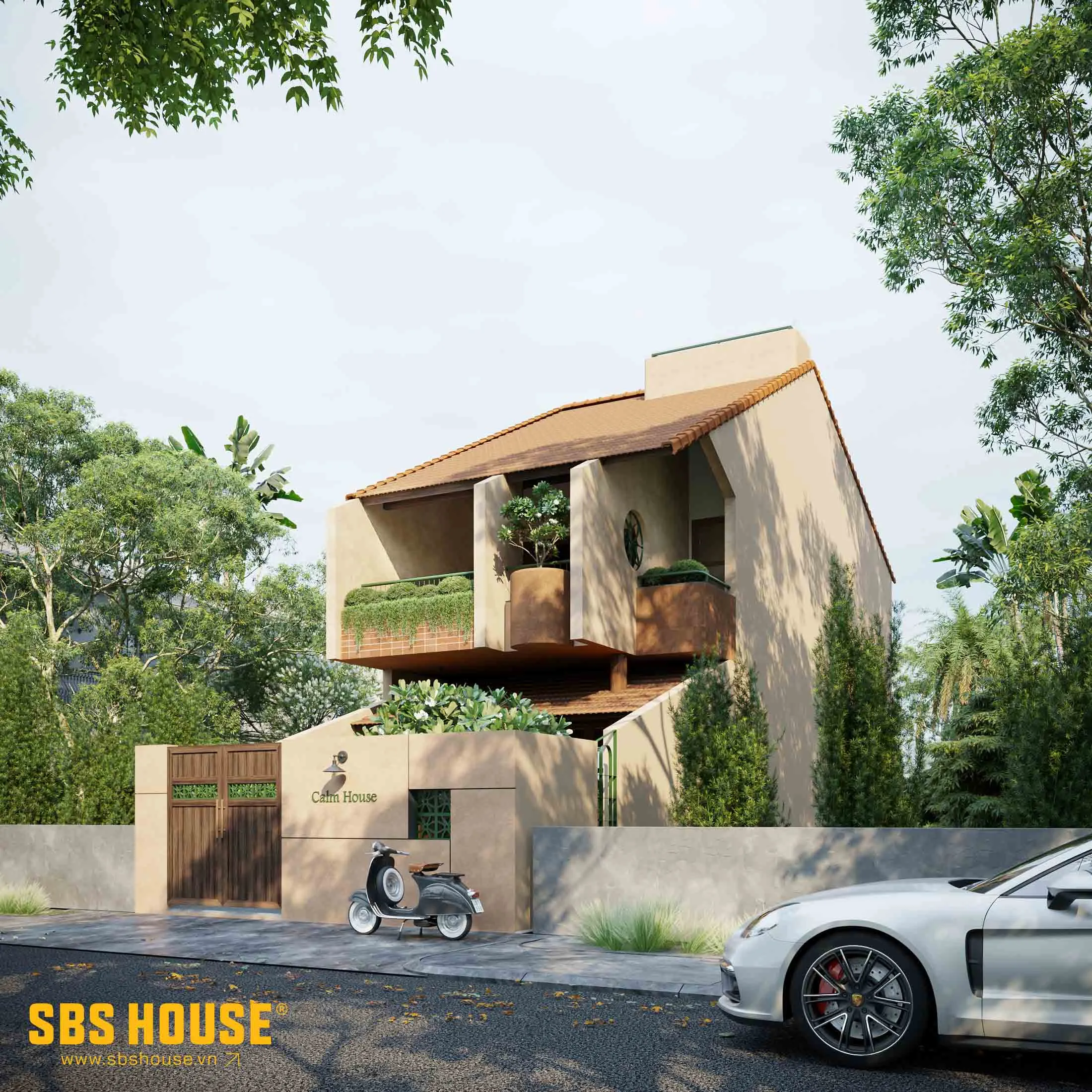 CalmHouse được thiết kế với kiến trúc mái ngói truyền thống, kết hợp với tone màu be và nâu, tạo cảm giác mộc mạc với hình ảnh quê hương.Bằng sự thấu hiểu thiên nhiên và con người, SBS HOUSE tập trung khai thác không gian, tự nhiên và sự kết nối. Các không gian chính như phòng khách, phòng bếp, phòng ngủ đều được bố trí hướng Đông Nam – hướng mát mẻ, giúp ngôi nhà luôn thông thoáng, dễ chịu. Khoảng sân trước được tận dụng làm vườn rau nhỏ, thay vì chỗ đậu ô tô. Đây là nơi ông bà có thể ngồi uống trà, ngắm cây xanh và chăm sóc khu vườn mỗi sáng. Một “công việc” nhẹ nhàng giúp tinh thần thoải mái và sức khỏe tốt hơn.