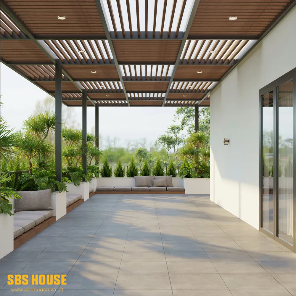 Ánh sáng tự nhiên được điều tiết vừa đủ, mang lại cảm giác an yên và tươi mới cho mỗi buổi sáng.Điểm nhấn khác biệt của công trình chính là hệ lam nhôm vân gỗ, chi tiết mang đậm dấu ấn SBS HOUSE. Lam nhôm không chỉ có tác dụng chắn nắng và điều tiết gió, mà còn tạo nên diện mạo kiến trúc tinh tế, hiện đại. Khi ánh nắng thay đổi, lam nhôm tạo ra hiệu ứng ánh sáng động, khiến mặt tiền luôn sinh động và tự nhiên.