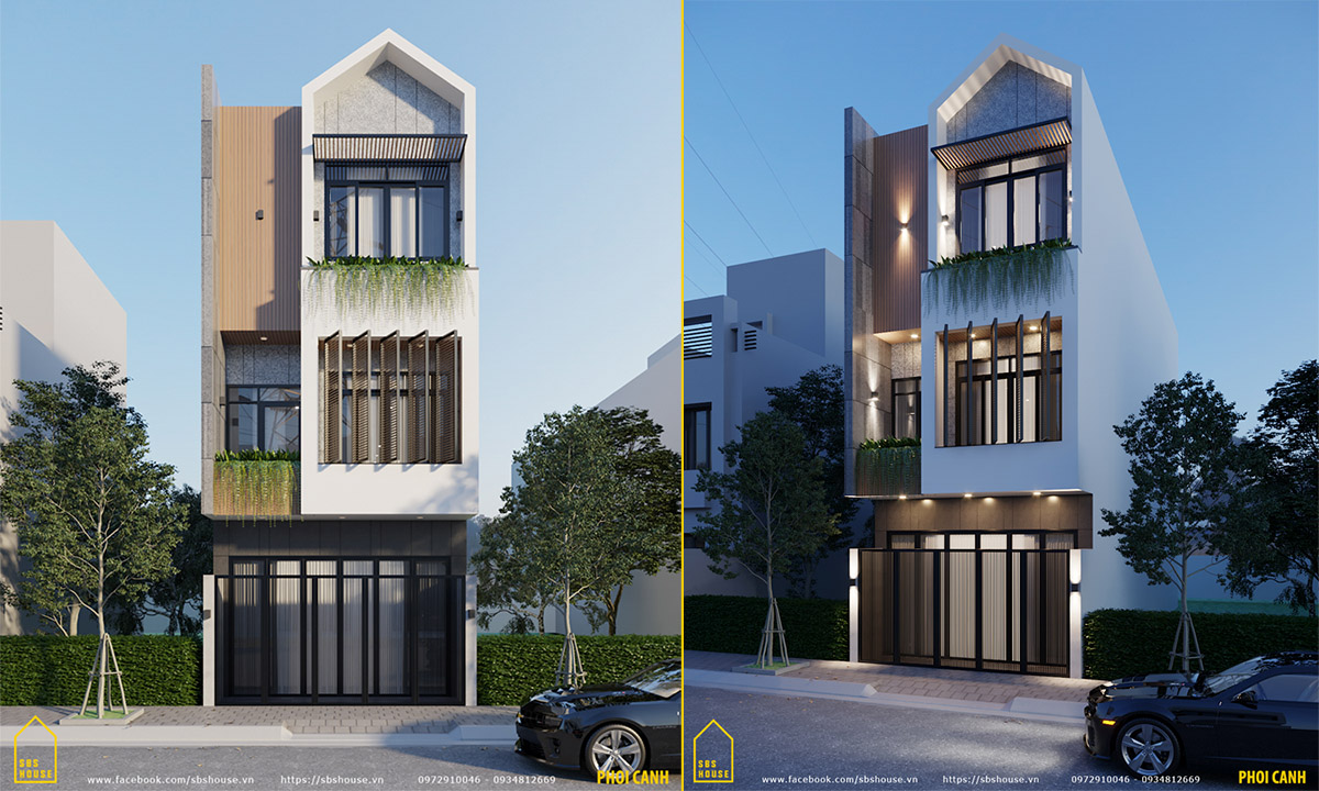 Ngôi nhà được thiết kế theo phong cách hiện đại, sử dụng những vật liệu hiện đại như vật liệu ốp conwood, hệ cây xanh ban công giúp cho ngôi nhà tăg tính thẩm mỹ và thông thoáng.Thẩm mỹ của ngôi nhà sẽ bị ảnh hưởng trực tiếp bởi màu sắc. Màu sắc được lựa chọn phải phù hợp với từng phong cách thiết kế riêng biệt, sở thích và phong thuỷ dành cho gia chủ. Bạn hãy yên tâm, khi bạn thiết kế nhà tại SBS HOUSE các kiến trúc sư dày dặn kinh nghiệm sẽ tư vấn và lựa chọn cho ngôi nhà của bạn màu sắc phù hợp nhất.