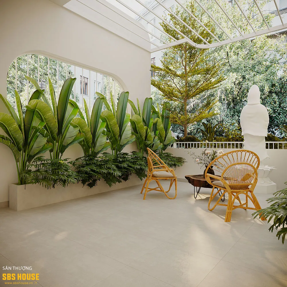 Mảng xanh không phủ đầy nhưng hiện diện ở những vị trí đủ để làm dịu mắt người ở. Chúng tạo ra các điểm dừng thị giác, giúp giảm tải căng thẳng sau ngày dài. Không gian bên trong không chỉ đẹp theo hình thức mà còn tạo được cảm xúc của sự chậm rãi, thoáng đãng và rất đời thường.
