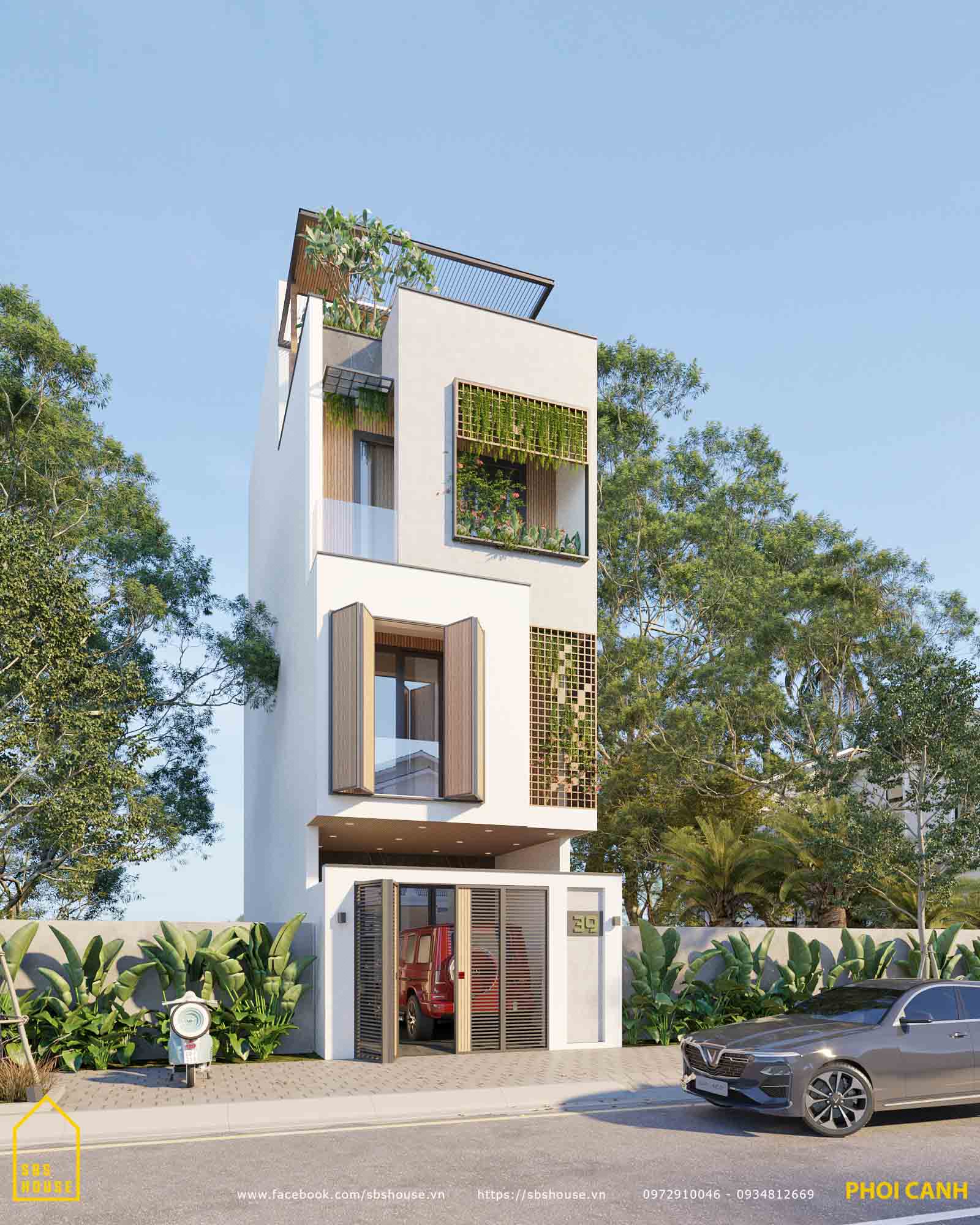 Mẫu nhà ống 4 tầng đẹp được kiến trúc sư SBS HOUSE thiết kế mặt tiền cân đối, thể hiện sự mạnh mẽ và hoàn hảo cho căn nhà cùng với điểm nhấn là hệ cây xanh ở ban công và sự kết hợp tinh tế của các vật liệu conwood đã tạo nên sự trẻ trung và hiện đại.