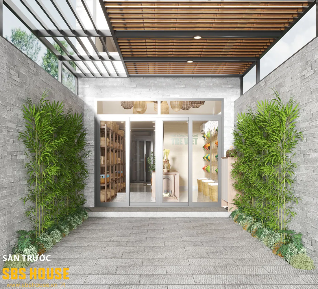 Khoảng sân nhỏ trước nhà cũng được chăm chút kỹ lưỡng. Tại đây, những bụi tre xanh mát kết hợp cùng bức tường đá tự nhiên tạo nên bầu không khí thân thiện, dễ chịu. Khách hàng khi ghé đến cửa hàng không chỉ nhìn thấy sản phẩm, mà còn cảm nhận được ngay tinh thần của thương hiệu qua chính không gian kiến trúc.