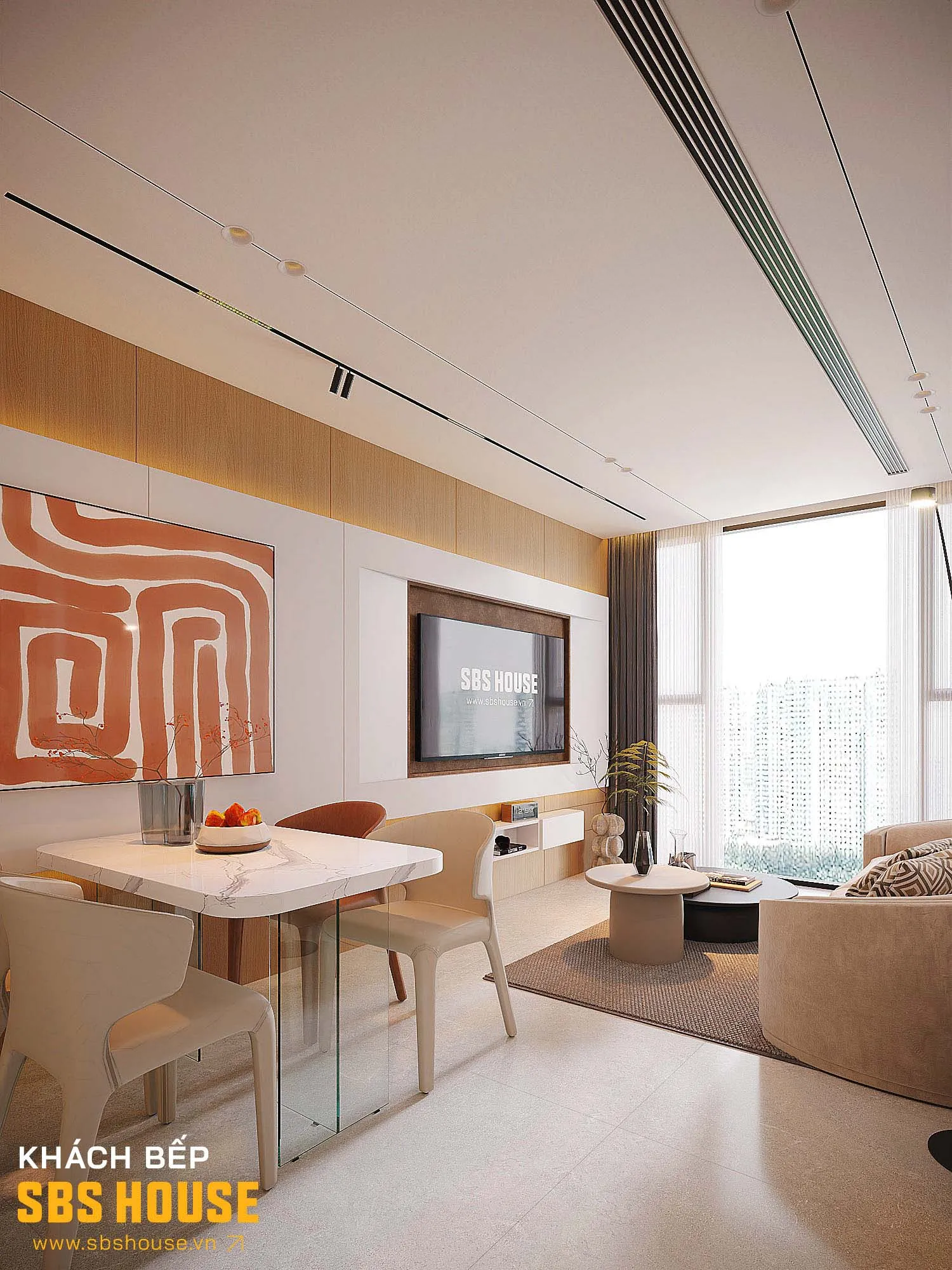 Trong màu trắng – nâu làm chủ đạo, tông cam được đan xen khéo léo tạo điểm nhấn cho không gianTận dụng nguồn sáng tự nhiên qua các hệ vách kính lớn, SBS HOUSE tính toán kỹ lưỡng vị trí bố trí nội thất để ánh sáng được lan tỏa đồng đều, hạn chế góc tối và giảm phụ thuộc vào ánh sáng nhân tạo vào ban ngày. Đây là yếu tố then chốt giúp căn hộ dù không quá lớn về diện tích vẫn mang lại cảm giác dễ chịu, thoải mái khi sinh hoạt.